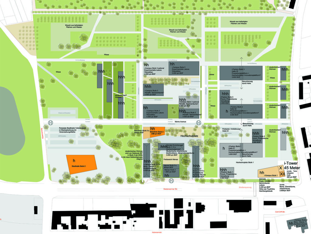 Es wird eine Entwicklung in Clustern von Süden nach Norden vorgesehen, die eine robuste Grundstruktur für die Entwicklungsschritte herstellt. Die kleinteilige Feldstruktur der Landwirtschaft im Westen von Schweinfurt spiegelt sich in diesem Flächenmosaik wider. In dieser Struktur ist ein unterschiedlich schnelles Wachstum der Komponenten i-Factory, i-Campus, studentisches Wohnen und der städtischen Nutzung denkbar. Das städtebauliche Leitbild bleibt in jeder Wachstumsphase erhalten. Ausgangspunkt der Entwicklung des Geländes ist die stark prägende Stadtachse, die durch die Niederwerrner Straße aufgebaut wird. Das studentische Wohnen ist folgerichtig angrenzend an die bestehende Wohnbebauung im Osten angedacht.